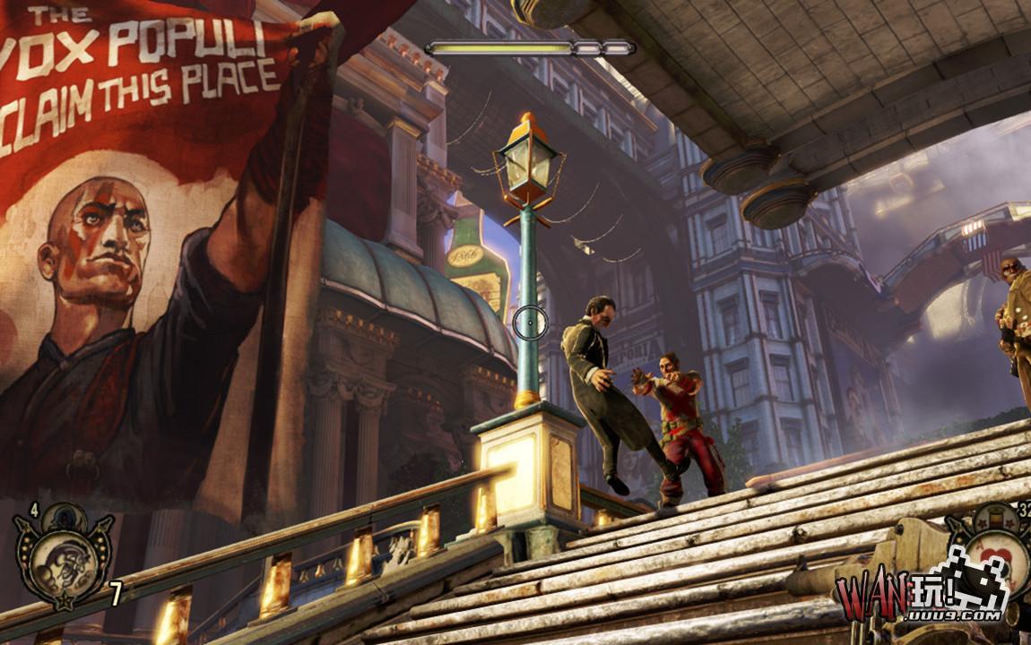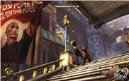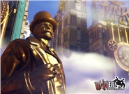 《生化奇兵:无限》将玩家带往1912年,那是巨型飞艇和浮空飞行器的全盛时期,在此背景下诞生了海底销魂城的前辈,即天空之城“哥伦比亚”:这座远离美国海岸自成一体的空中城市在信众的欢呼声中扶摇直上,寄托了美利坚强国之梦,但因其不可告人的目的使其似锦前程不久便急转直下,武装到牙齿的狰狞面目把原本光荣正确伟大的阿波罗登月变成邪恶的死星计划,整座城市消失在云端中自此再无人知晓。