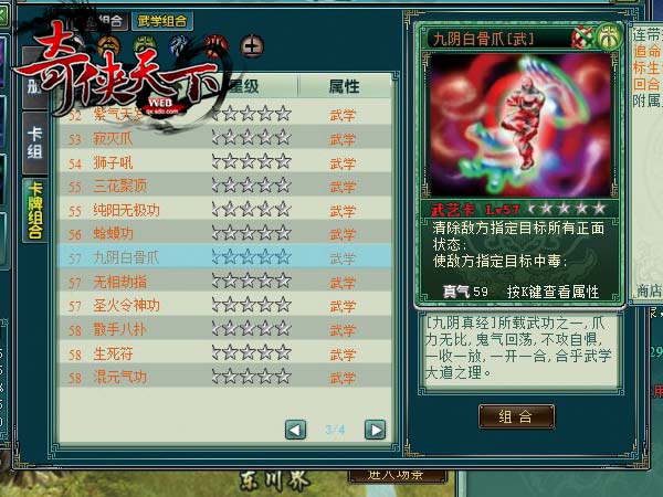 《奇侠天下》是由成都星漫科技精心巨制的一款以金庸武侠为题材的WEB game。创新的战斗模式,不仅拥有传统回合制网游的休闲娱乐性,还可从全新的卡牌式对战中体验到武功千变万化、招式随意组合。五行元素的植入, 写实的美术风格,令人回味的剧情,淋漓尽致的展现出纯正武侠的魅力!
